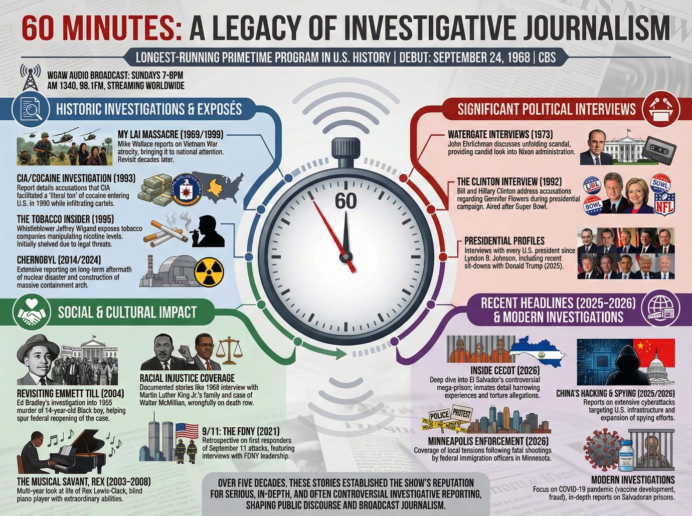 60 Minutes is an American television news magazine that has aired on CBS since its debut on September 24, 1968. It is the longest-running primetime program in U.S. history and is renowned for its hard-hitting investigative journalism, newsmaker interviews, and in-depth profiles. WGAW carries the AUDIO of the program every Sunday from 7-8pm on AM 1340, 98.1FM, and streaming worldwide