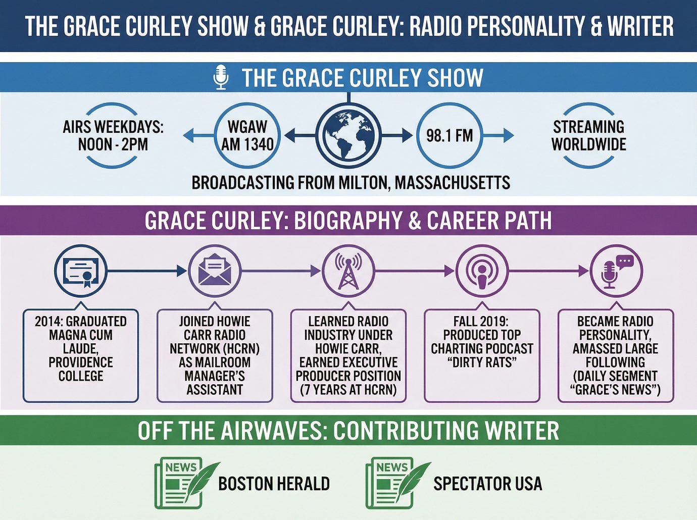 Grace Curley is from Milton, Massachusetts and off the airwaves is also a contributing writer for the Boston Herald and Spectator USA. Curley graduated Magna Cum Laude from Providence College in 2014 and became a mailroom manager’s assistant for the Howie Carr Radio Network. Curley learned about the radio industry from Howie Carr and soon earned the position of Executive Producer. In the fall of 2019, Grace produced the top charting podcast Dirty Rats and quickly became a radio personality, amassing a large following.